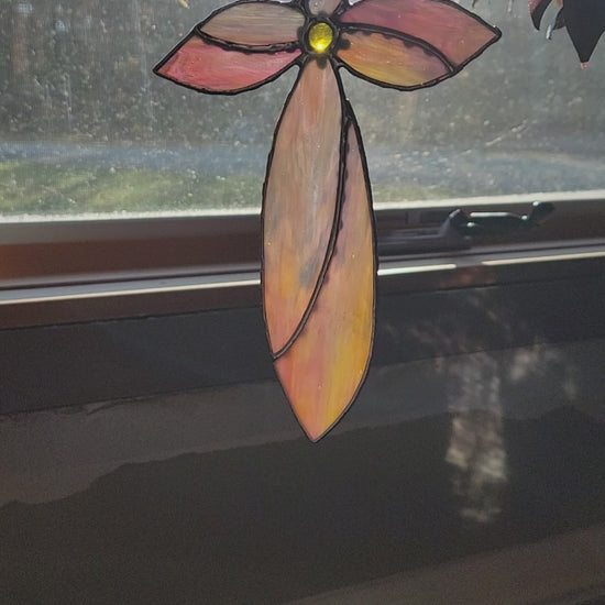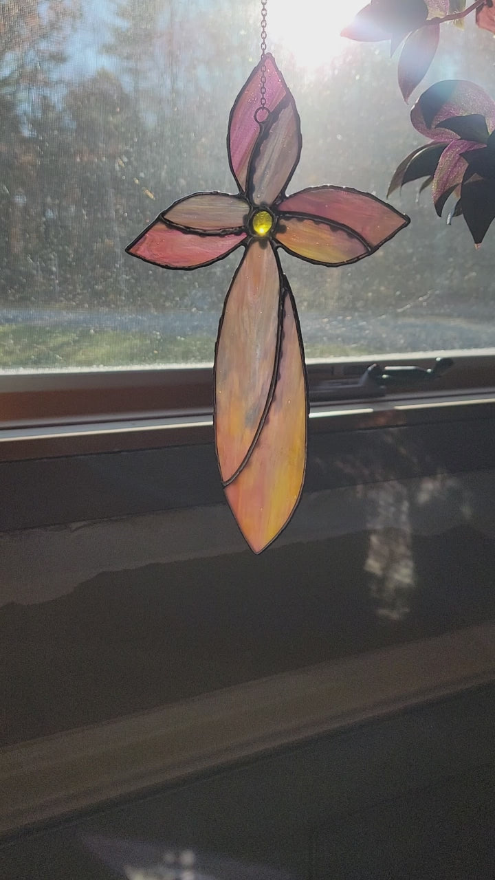 This stunning 9" x 6" multicolored, stained-glass cross, hanging from a 9" silver chain, with a central yellow glass button and shinny silver detailed solder, is a big seller for any faithful home.