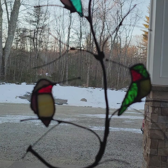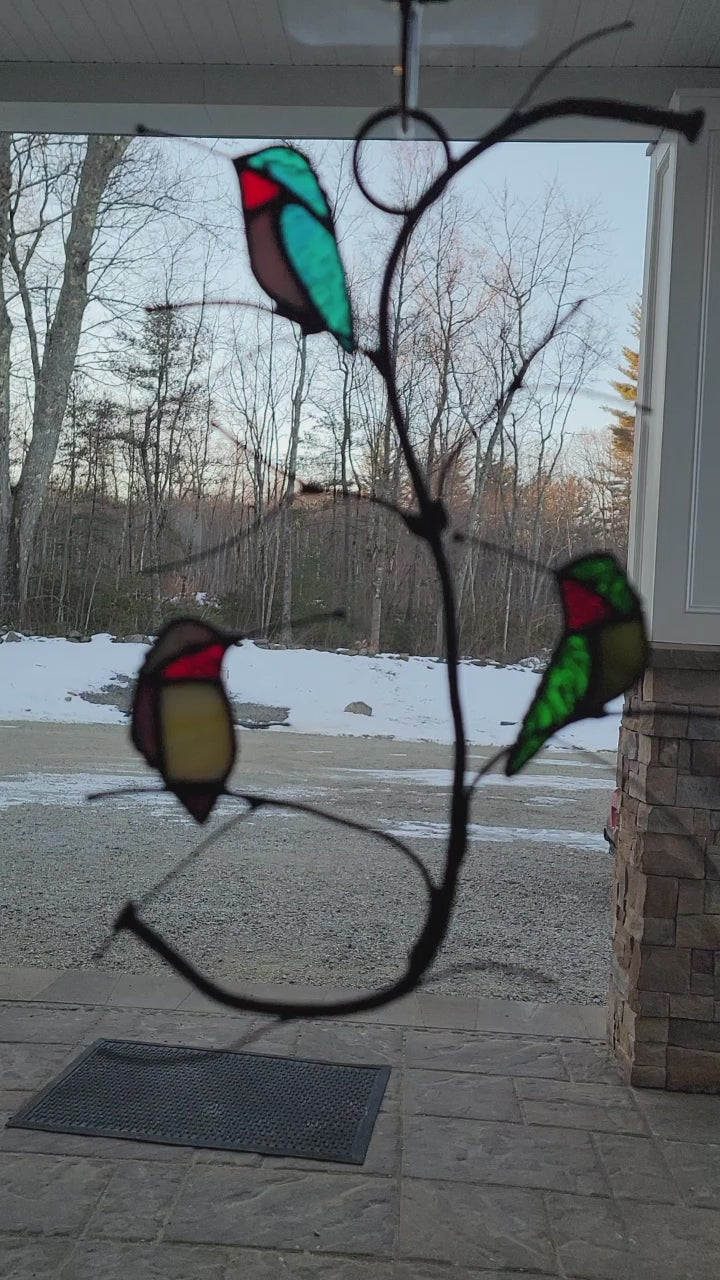Three beautiful hummingbirds purched on a branch, is so adorable in any window. This 13" x 8" piece of art is made from the heart and is a great gift for any loved one.